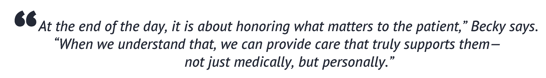 “Having these conversations early is one of the greatest gifts you can give yourself and your family,” Becky says. “It’s about moving beyond clinical checklists and truly uncovering What Matters to you. When we know your values, we can ensure your care plan honors them, no matter what the future holds.”