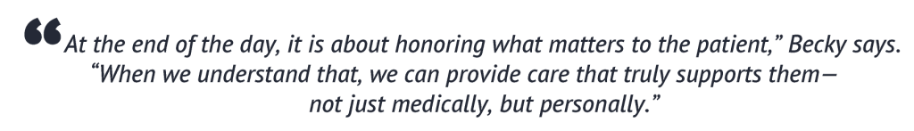 “Having these conversations early is one of the greatest gifts you can give yourself and your family,” Becky says. “It’s about moving beyond clinical checklists and truly uncovering What Matters to you. When we know your values, we can ensure your care plan honors them, no matter what the future holds.”